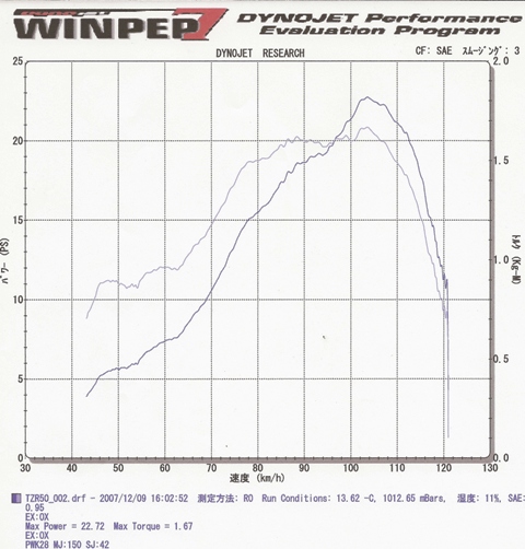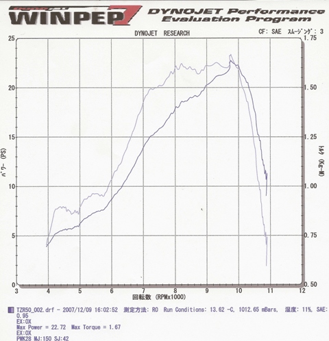 カタログスペックで22ps/10000rpmの1.7kg・m/8500rpmなので、ほぼカタログスペックどおり。